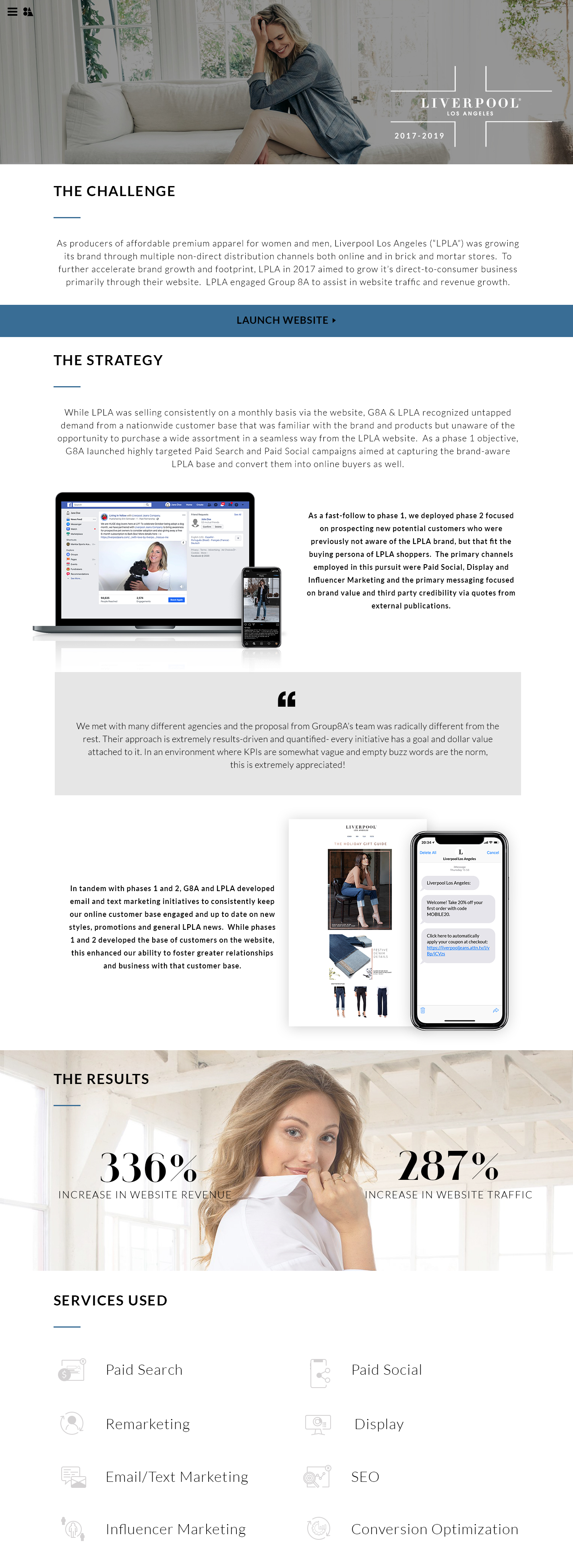 As producers of affordable premium apparel for women and men, Liverpool Los Angeles (“LPLA”) was growing its brand through multiple non-direct distribution channels both online and in brick and mortar stores. To further accelerate brand growth and footprint, LPLA in 2017 aimed to grow it’s direct-to-consumer business primarily through their website. LPLA engaged Group 8A to assist in website traffic and revenue growth.