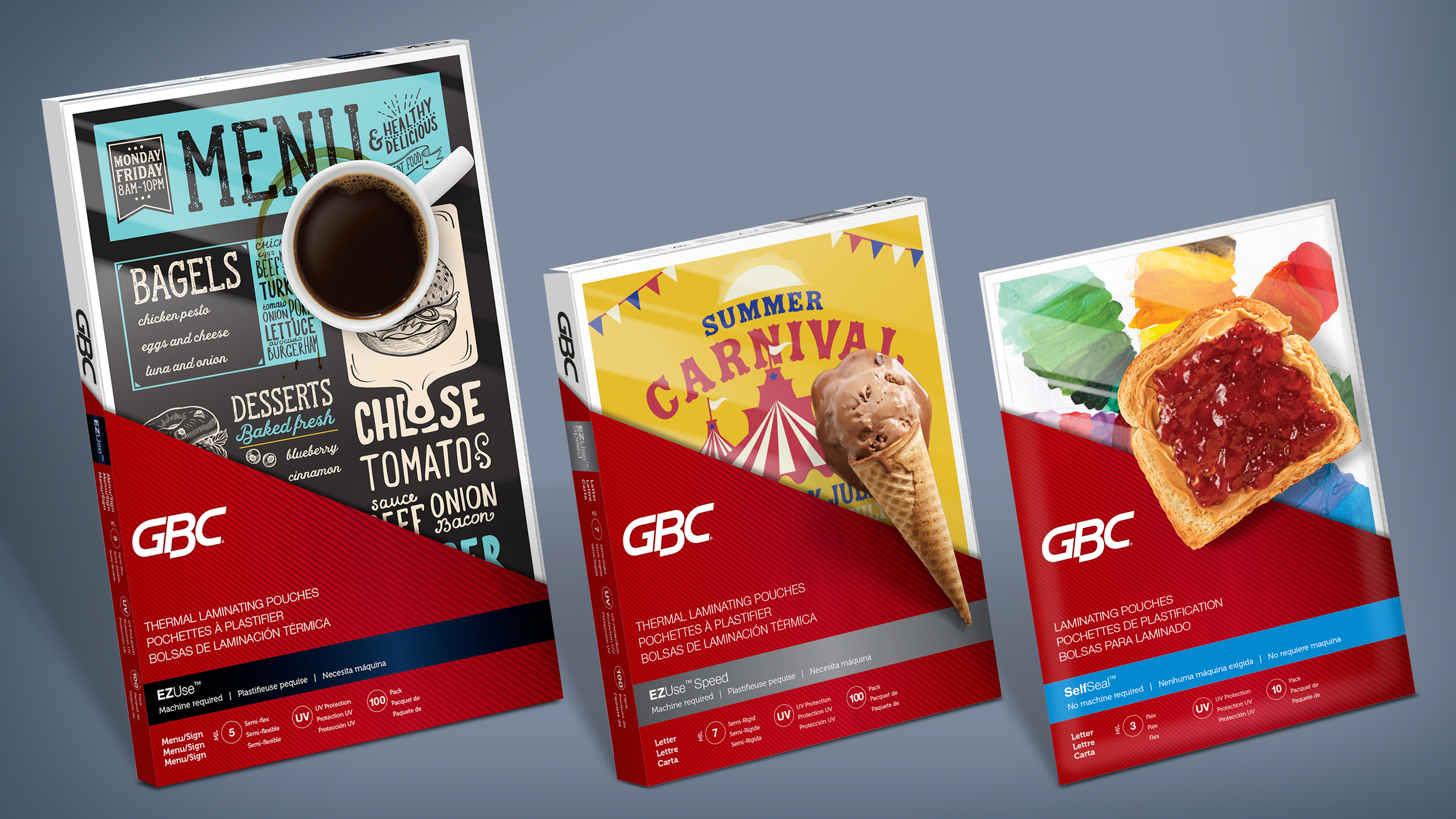 The office supply category isn't known for the personality in its packaging. Laminating pouches are no exception. To bring out the benefits of laminating sheets of paper, we chose to tell visual stories that used items resting on top of the sheet as if dropped or spilled. The sheet protected beneath relates to the items spilled and creates a dimensional story at retail.Client