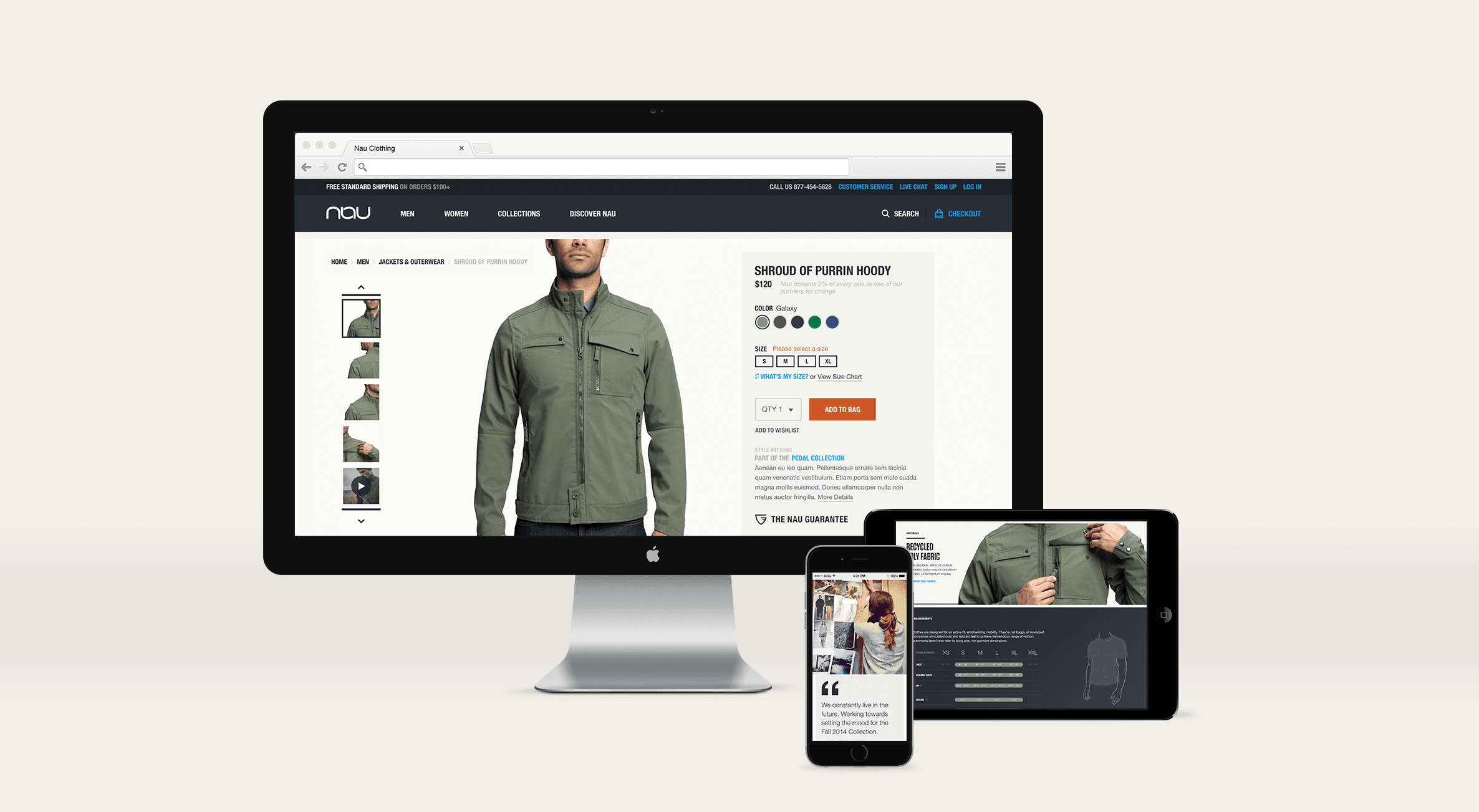 The site emulated Nau's product design principles, pushing the boundaries of style, performance and innovation. We infused product pages with a new level of detail to highlight the products better, noting subtle details to engage and educate users throughout their experience with the brand.