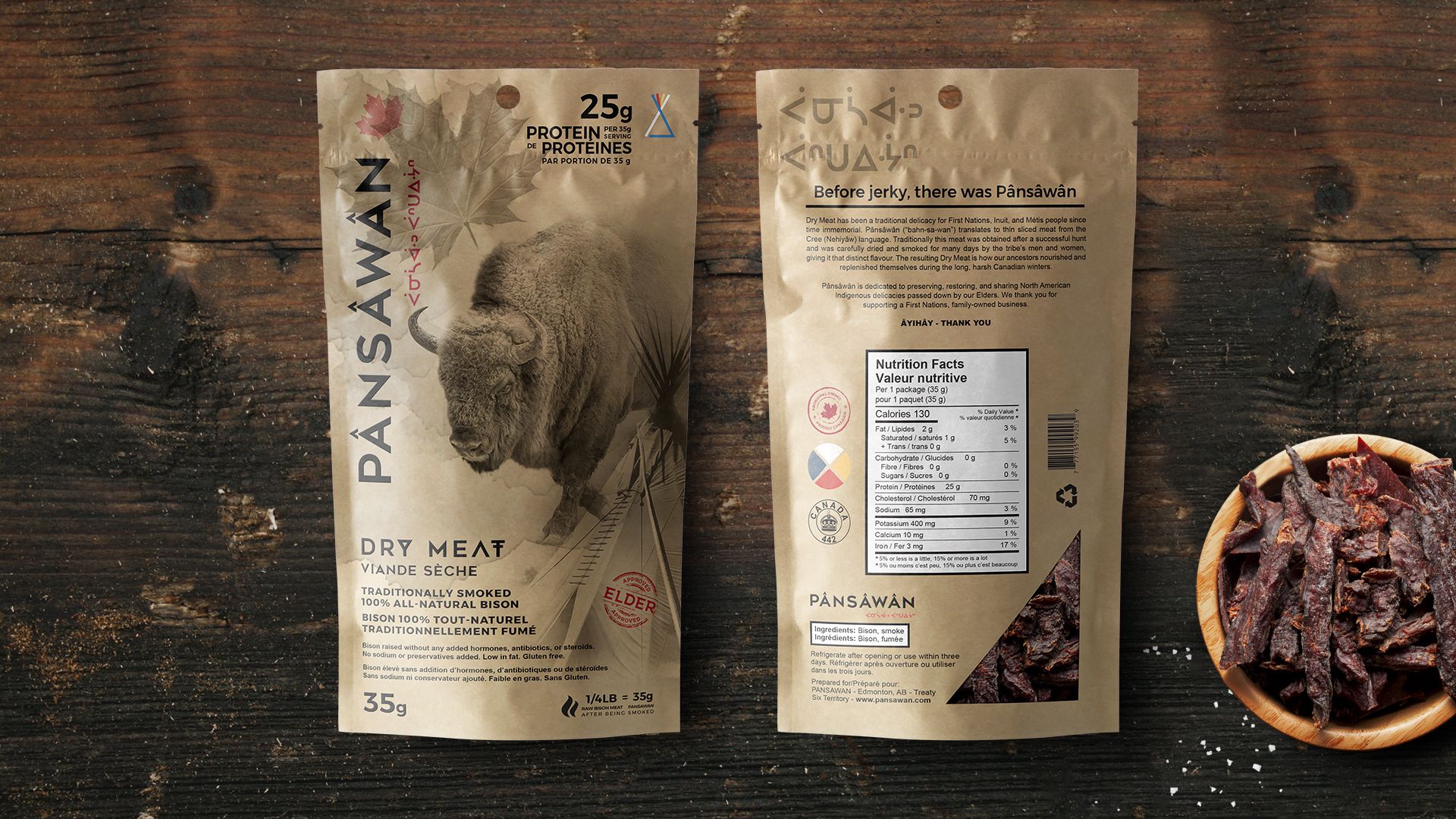 What we love about Pânsâwân brand is that it’s artistic and rich in tradition. The kraft packaging, teepee, Cree syllabics, and the Buffalo tells preserves not only the product, but an important piece of history too. For the Cree people, Pânsâwân (“bahn-sa-wan”) meant surviving the long, harsh Canadian winters. After a successful hunt, the tribe prepared Pânsâwân by thinly slicing strips of lean buffalo meat and smoking them hours, giving it that rich, distinct flavor.