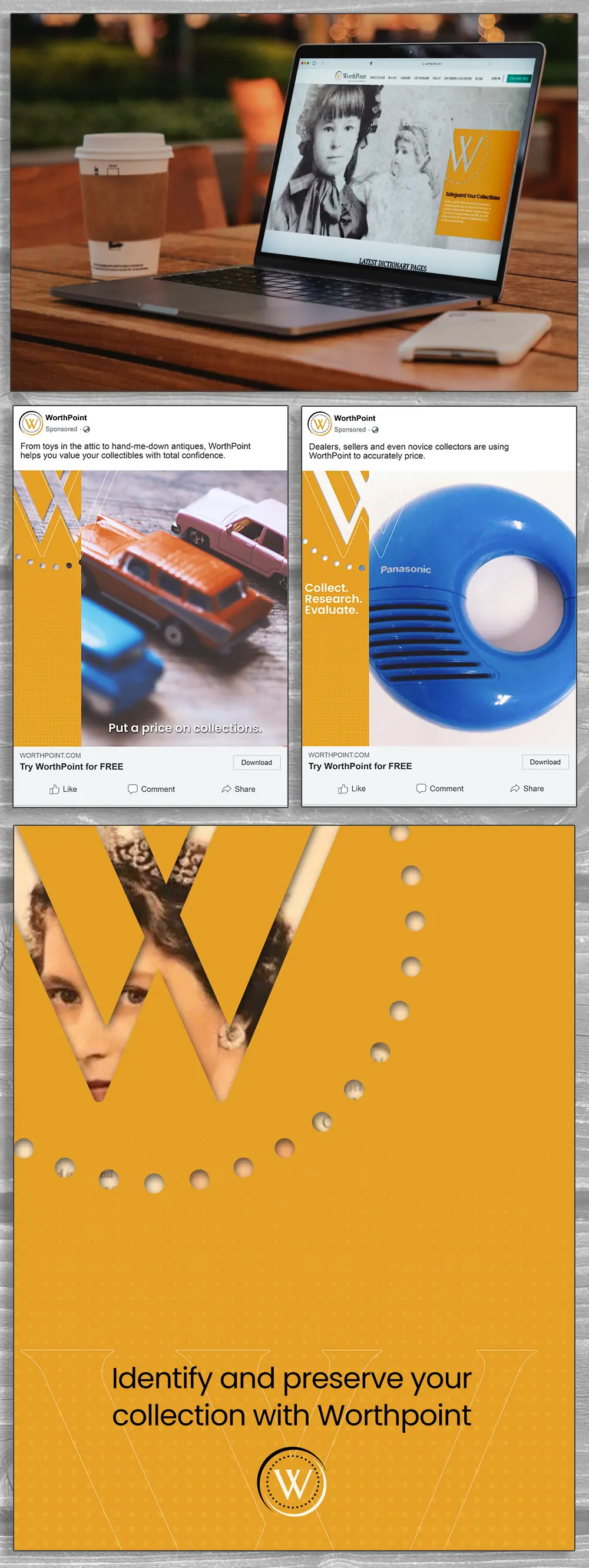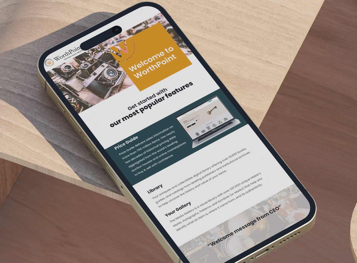 Seventy Seven Collective partners with WorthPoint on a multitude of projects that aid in keeping their marketing and brand presence fresh and exciting. WorthPoint is an online resource where collectors can discover and value their collectibles through their unique pricing guide, which aids in purchasing through data and trends to deliver top-notch results. In early 2023, we helped refresh how their brand appeared in marketing materials among various expressions, including ad campaigns, email drip sequences, and social media. The 77co team partners with WorthPoint monthly to deliver exceptional marketing strategy with flawless creative execution. Client