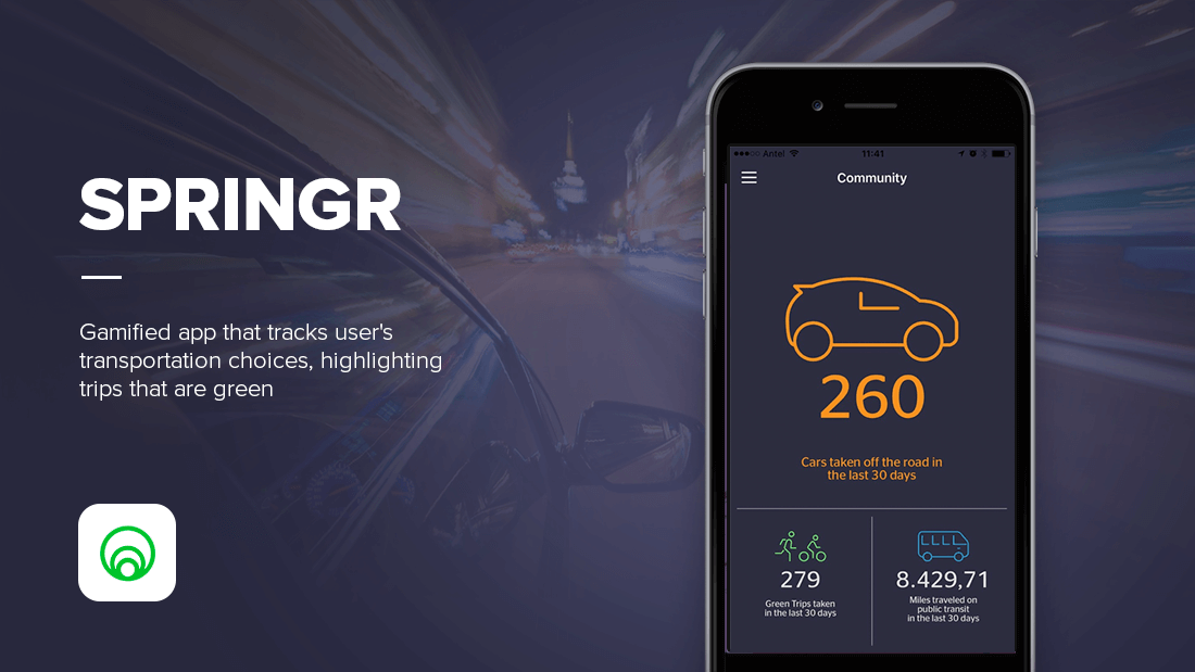 Springr is a gamified mobile app that tracks users’ transportation choices and highlights trips that are green, carbon-neutral, and friendly.