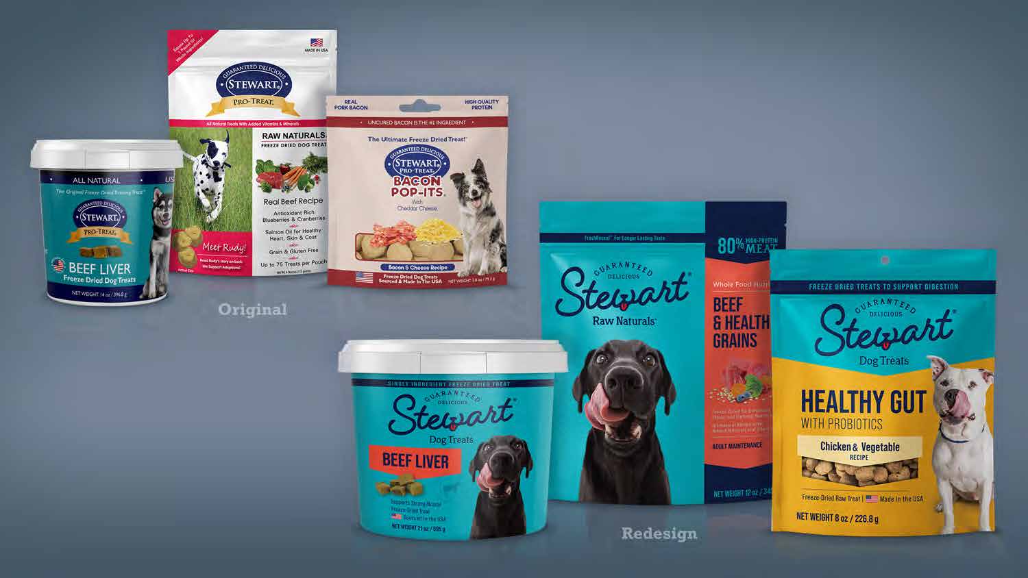 The Stewart pet food brand had grown through mergers so the packaging became an amalgam of former brand communication. There was a loyal audience that required we maintain the teal color, but all other elements were fair game.