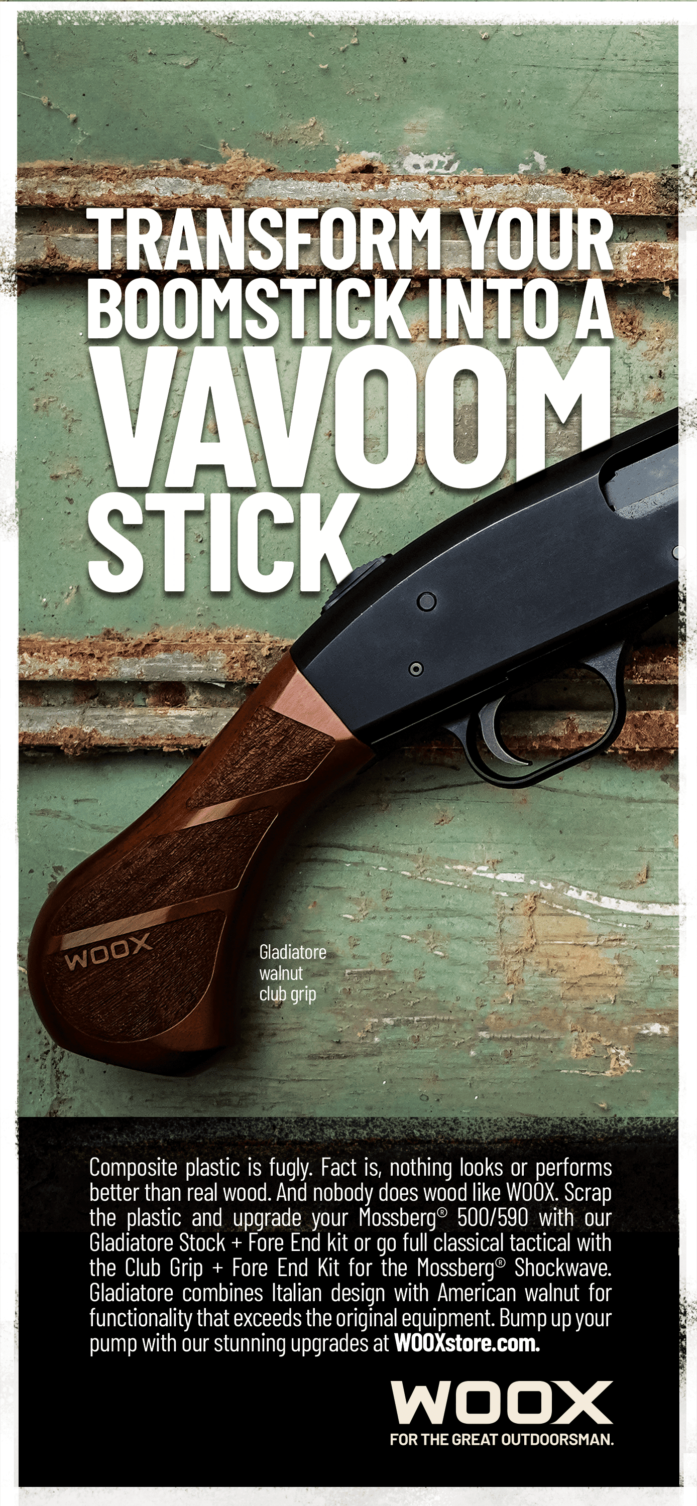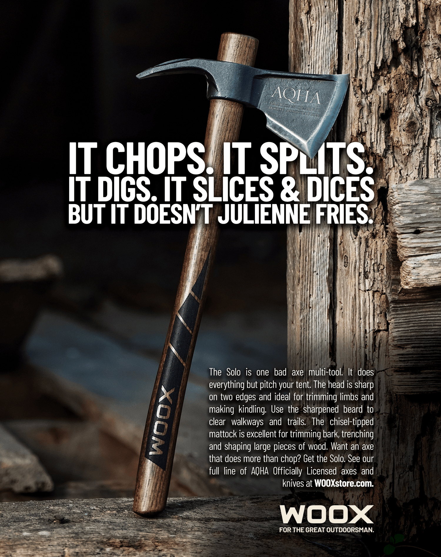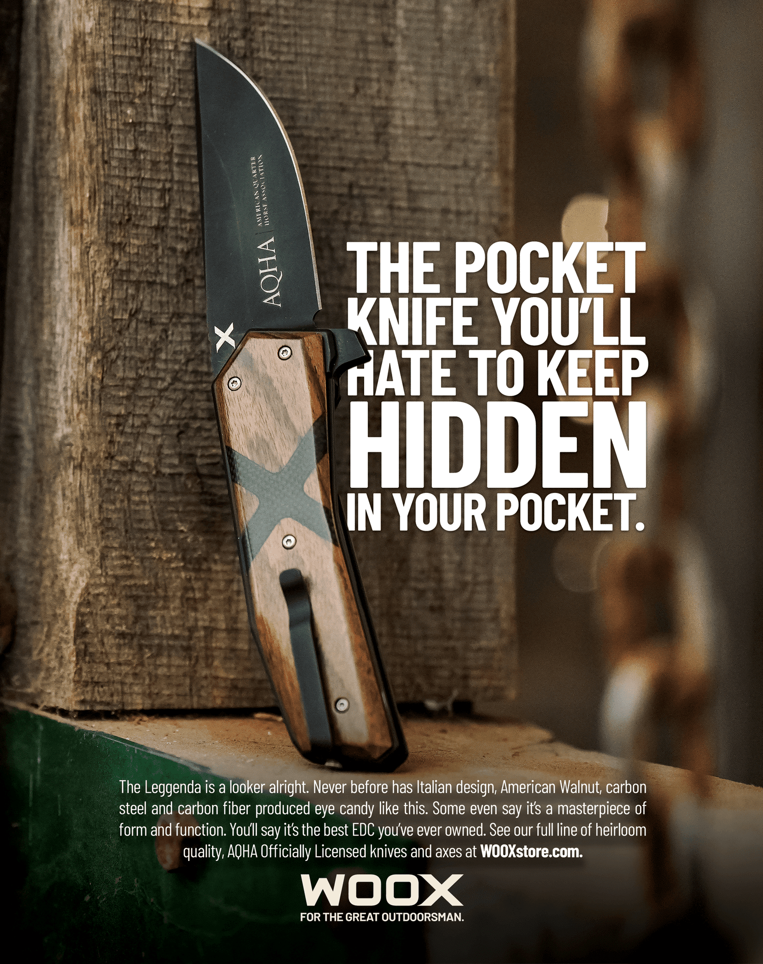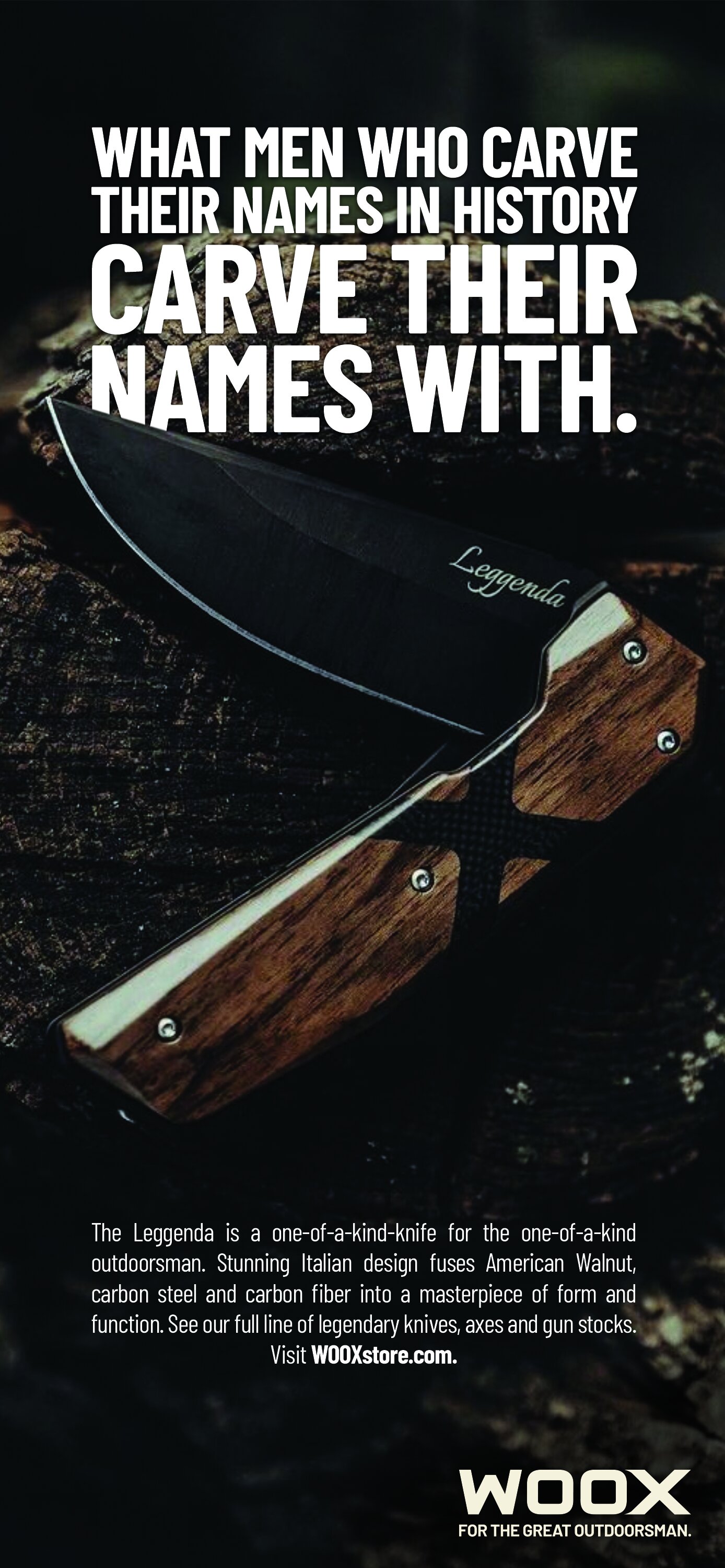 Designed in Italy and made in America, each and every axe, gun stock and knife WOOX makes is meticulously crafted to last. Everything WOOX sells is a masterwork in form and function that elicits pride in ownership. With these brand values in mind, we positioned WOOX as “extraordinary heirloom gear for extraordinary outdoor enthusiasts.” Client